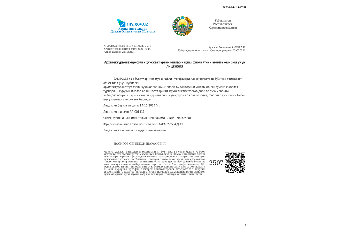 Компания «Санипласт» была основана в 1992 г. при участии НПО САНИИРИ и Израильской компании Plastro Gvat. Более чем 20 лет «Санипласт» успешно работает на рынке Узбекистана и является ведущим разработчиком и производителем современных технологий орошения, дождевания, а так же систем водоочистки, в частности для плавательных бассейнов, сельскохозяйственного и питьевого водоснабжения. В состав ООО «Санипласт» входят дочерние предприятия и ООО «Санипласт-сервис».